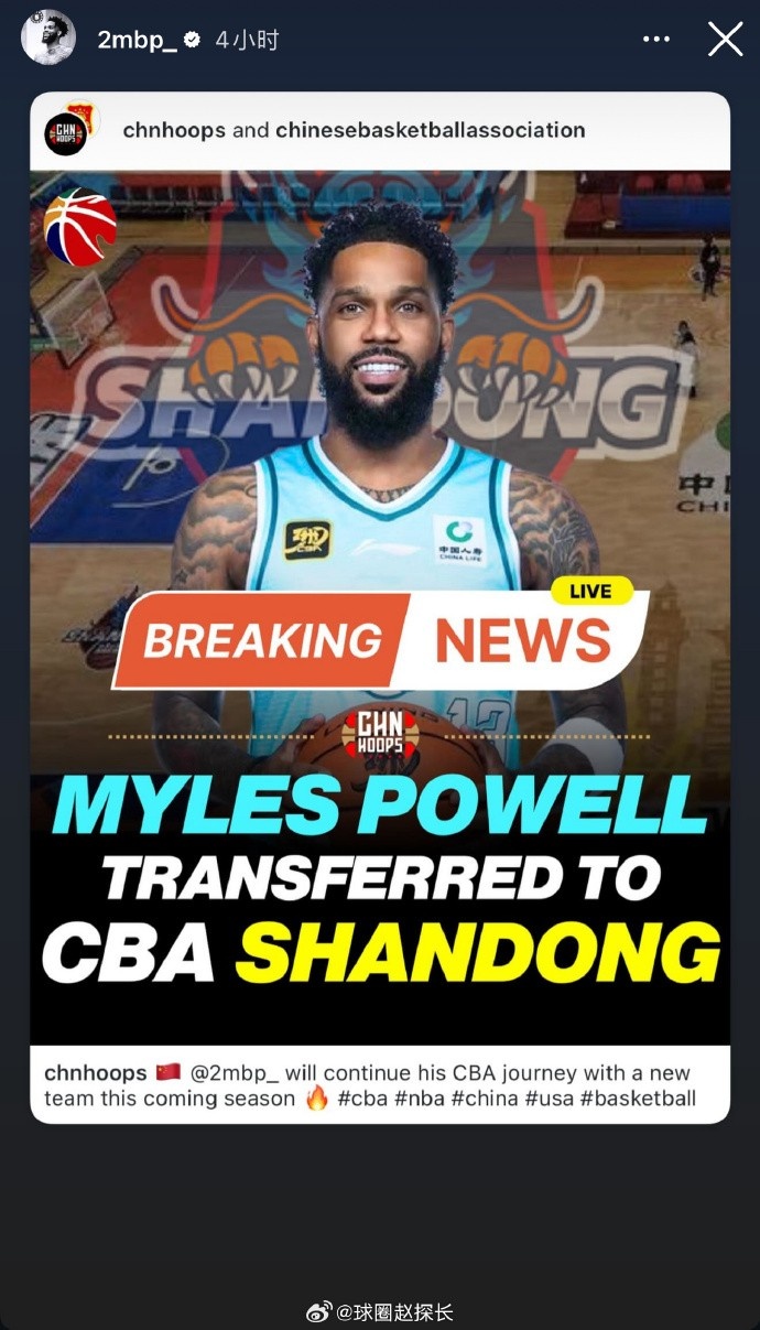 @球圈赵探长 在个人微博上写道:“鲍威尔已经自宣加盟山东男篮,这位效力过青岛男篮两个赛季的外援,新赛季将重返CBA。