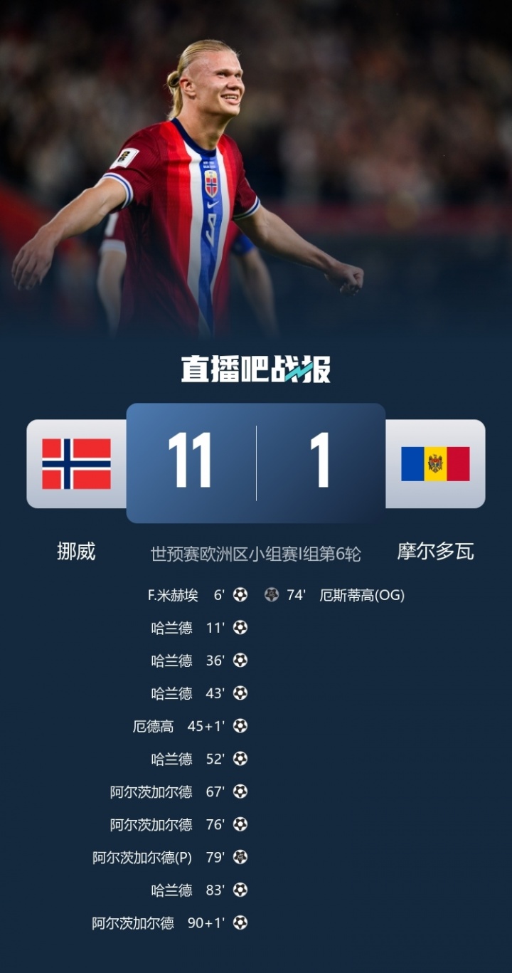 哈兰德5球2助,挪威11-1狂胜摩尔多瓦,五连胜领跑。