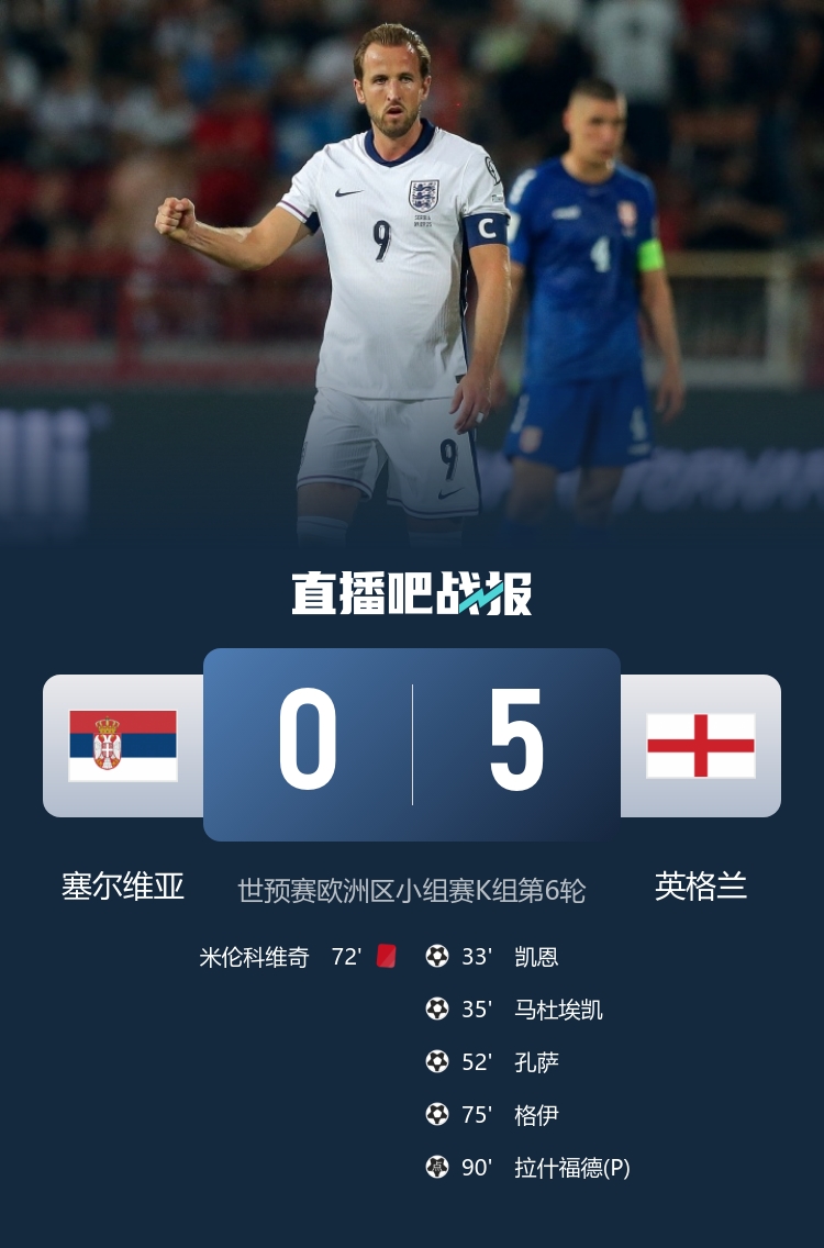 凯恩破门,英格兰5-0大胜塞尔维亚,继续以全胜战绩在小组中领跑。