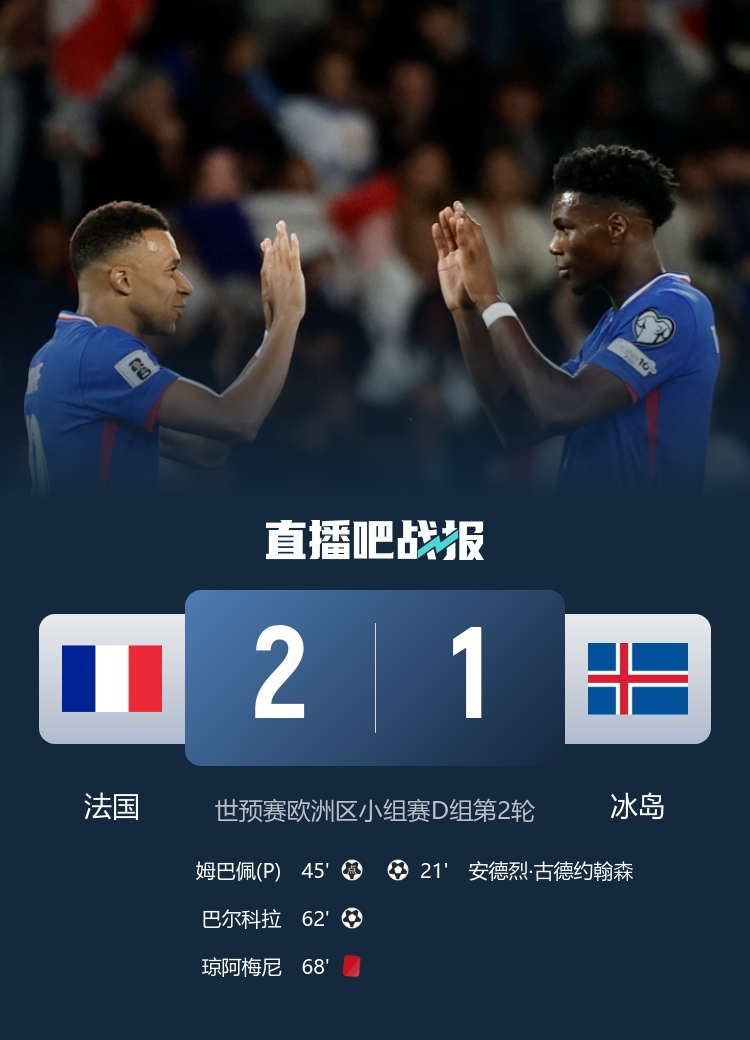 姆巴佩点射,巴尔科拉破门,琼阿梅尼直红,法国2-1战胜冰岛两连胜领跑。
