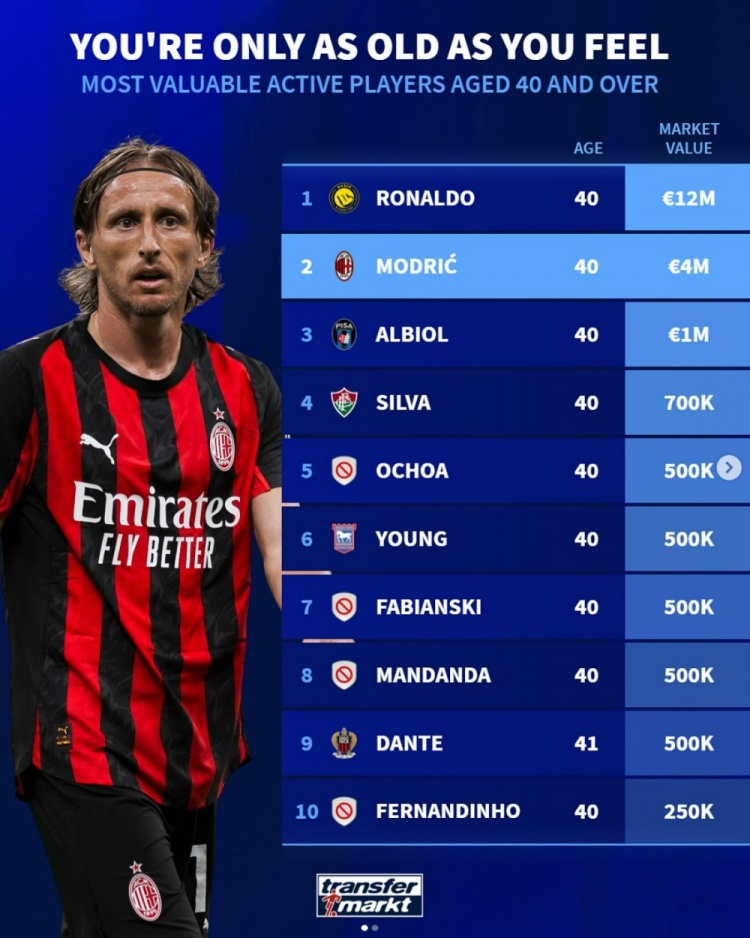 莫德里奇迎来40岁生日,德转也盘点了现役足坛40岁及以上球员身价榜,其中C罗居首,莫德里奇次席。